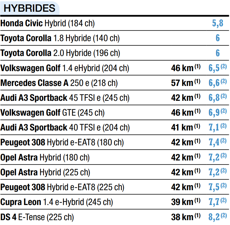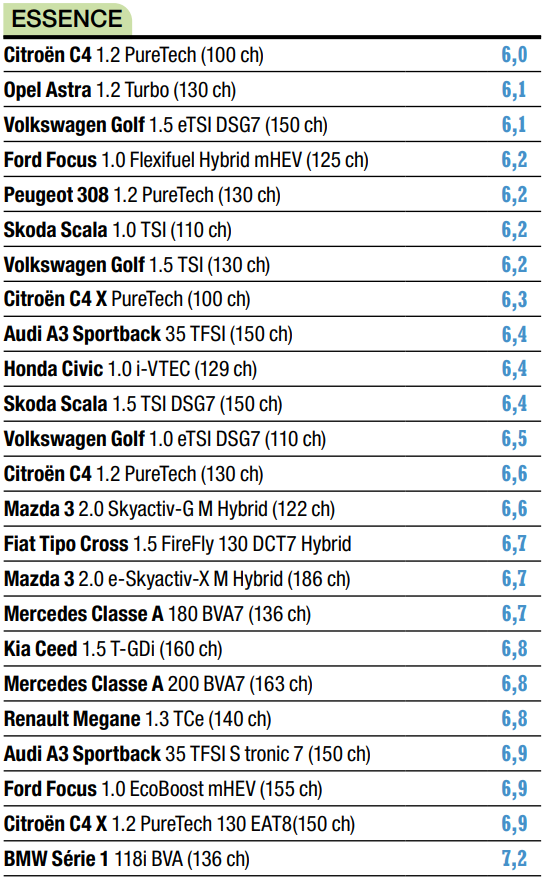 Just behind, we find two compact sedans with German origins. You have the Opel Astra 1.2 Turbo (130 hp) and the Volkswagen Golf 1.5 eTSI DSG7 (150 hp) which have an average consumption of 6.1 l/100 km.