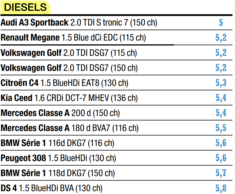 Behind the Audi A3, we find the Renault Megane 1.5 Blue dCi EDC (115) and two Volkswagen Golf 2.0 TDO DSG7 in 115 and 150 hp versions, both of which have an average consumption of 5.2 l/100 km.